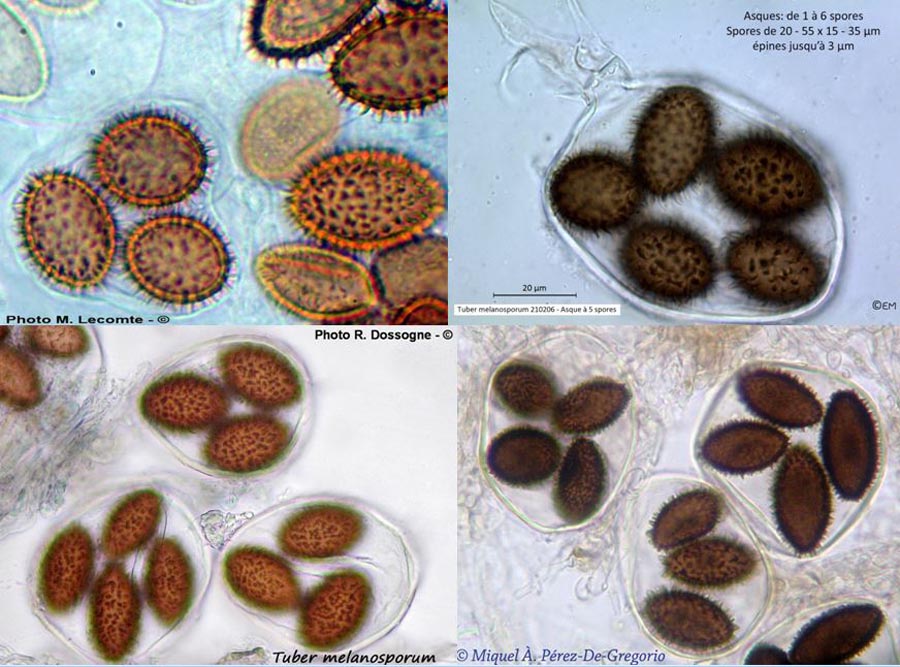 - Similar species: Tuber melanosporum spores can easily be confused with Tuber brumale spores. Tuber melanosporum spores tend to be less translucid and have shorter spines than Tuber brumale. Tuber indicum complex are similar in shape, color and spines.